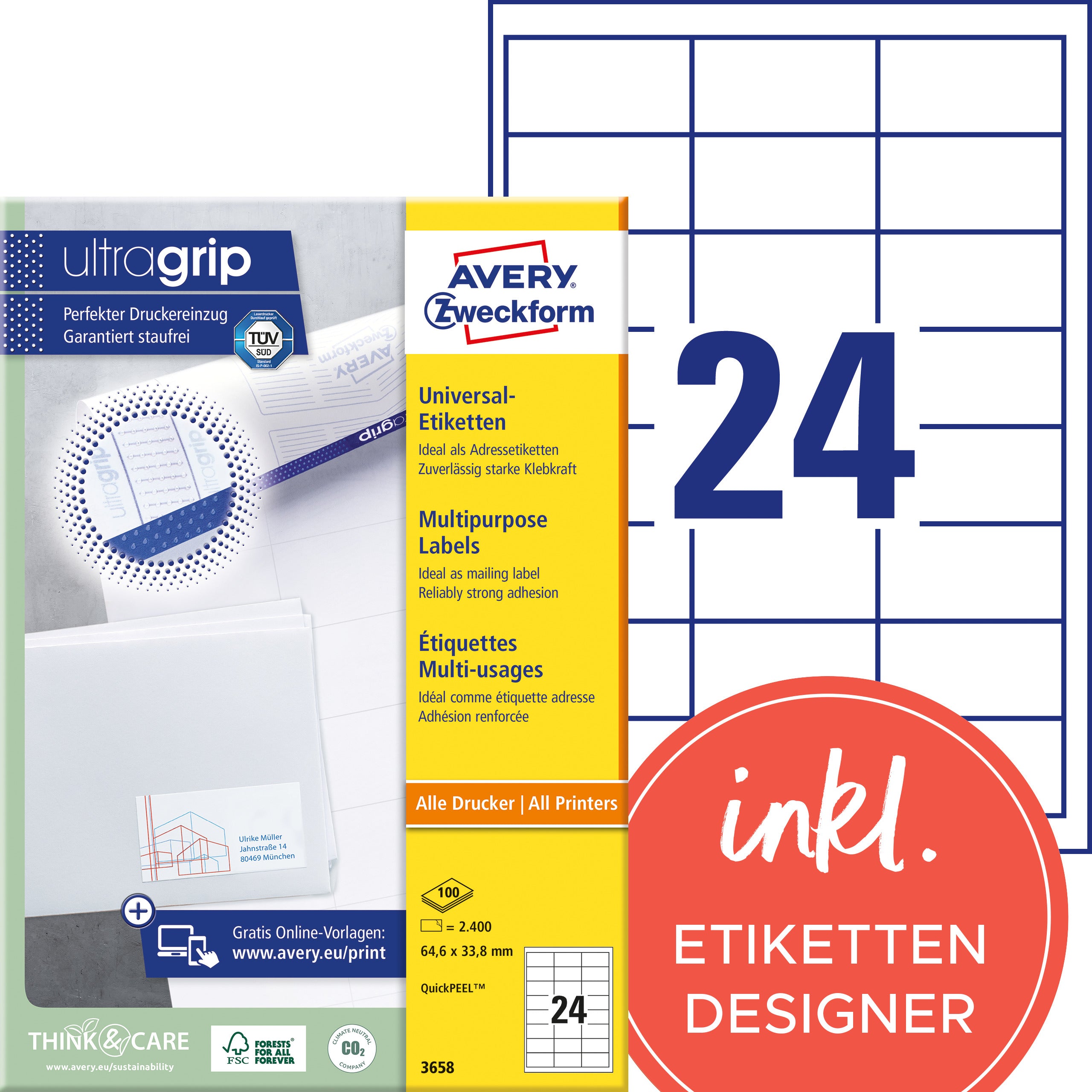 Qualität vom Etiketten-Experten: die weissen Universal-Etiketten 3658 im Format 64,6 x 33,8 mm von Avery Zweckform haften mit starker permanenter Klebkraft absolut zuverlässig auf Papier, Karton, Glas und vielen gängigen Kunststoffen. Sie sind die Premium-Lösung zur Beschriftung von Unterlagen, Dokumenten und vielem mehr in Office und Home Office oder auch privat. Zum Adressieren und zur Eigentumskennzeichnung (2.400 Etiketten/Pack) ist das Format besonders geeignet. ultragrip® macht ultra-effizient: die innovative ultragrip®-Technologie mit dem spürbaren Profil auf dem Etikettenbogen gewährleistet einen ultra-präzisen und absolut staufreien Druckerdurchlauf. Regelmässig überprüft und für Laser bestätigt durch TÜV Süd. Ideal auch für Seriendruck und grössere Druckaufträge. Geeignet für alle Laser- und Inkjet-Drucker. So arbeiten Sie effizient wie stressfrei und schaffen sich wertvolle Zeit für die wirklich wichtigen Dinge. Ideen drucken ? einfach & professionell: mit Etiketten von Avery Zweckform können Sie den kostenlosen Online Etiketten-Designer unter www.avery.eu/print nutzen. Gestalten Sie Ihr Etikett mit der Software komplett selbst, verwenden Sie eine der Design-Vorlagen zu zahlreichen Themen, die Sie individuell anpassen können oder laden Sie Ihr fertiges Design hoch und drucken anschliessend standgenau aus. So schnell und einfach sorgen Sie für einen professionellen Auftritt. Think & Care ? Avery Zweckform ist seit 2020 klimaneutral: die Treibhausgasemissionen des Standortes werden durch zertifizierte Klimaschutzprojekte ausgeglichen. Schon seit 2014 wird ausschliesslich Ökostrom/-gas verwendet. Forschung, Entwicklung, Produktion, Logistik und Verwaltung am Firmenstandort in Oberlaindern/Bayern garantieren höchste Qualitäts- und Umweltstandards sowie kurze Lieferwege. Das Obermaterial dieser chlorfrei gebleichten Etiketten wird zu 100% aus FSC®-zertifiziertem Papier aus verantwortungsvoll bewirtschafteten Wäldern hergestellt.