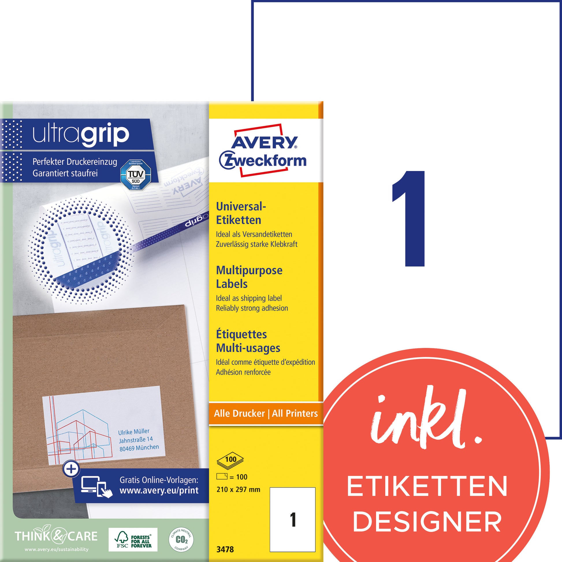 Qualität vom Etiketten-Experten: die weissen Universal-Etiketten 3478 im Format 210 x 297 mm von Avery Zweckform haften mit starker permanenter Klebkraft absolut zuverlässig auf Papier, Karton, Glas und vielen gängigen Kunststoffen. Sie sind die Premium-Lösung zur Beschriftung von Unterlagen, Dokumenten und vielem mehr in Office und Home Office oder auch privat. Zur Beschriftung von Sammelmappen, als Inhaltskennzeichnung oder für den Versand (100 Etiketten/Pack) ist das Format besonders geeignet. ultragrip® macht ultra-effizient: die innovative ultragrip®-Technologie mit dem spürbaren Profil auf dem Etikettenbogen gewährleistet einen ultra-präzisen und absolut staufreien Druckerdurchlauf. Regelmässig überprüft und für Laser bestätigt durch TÜV Süd. Ideal auch für Seriendruck und grössere Druckaufträge. Geeignet für alle Laser- und Inkjet-Drucker. So arbeiten Sie effizient wie stressfrei und schaffen sich wertvolle Zeit für die wirklich wichtigen Dinge. Ideen drucken ? einfach & professionell: mit Etiketten von Avery Zweckform können Sie den kostenlosen Online Etiketten-Designer unter www.avery.eu/print nutzen. Gestalten Sie Ihr Etikett mit der Software komplett selbst, verwenden Sie eine der Design-Vorlagen zu zahlreichen Themen, die Sie individuell anpassen können oder laden Sie Ihr fertiges Design hoch und drucken anschliessend standgenau aus. So schnell und einfach sorgen Sie für einen professionellen Auftritt. Think & Care ? Avery Zweckform ist seit 2020 klimaneutral: die Treibhausgasemissionen des Standortes werden durch zertifizierte Klimaschutzprojekte ausgeglichen. Schon seit 2014 wird ausschliesslich Ökostrom/-gas verwendet. Forschung, Entwicklung, Produktion, Logistik und Verwaltung am Firmenstandort in Oberlaindern/Bayern garantieren höchste Qualitäts- und Umweltstandards sowie kurze Lieferwege. Das Obermaterial dieser chlorfrei gebleichten Etiketten wird zu 100% aus FSC®-zertifiziertem Papier aus verantwortungsvoll bewirtschafteten Wäldern hergestellt.