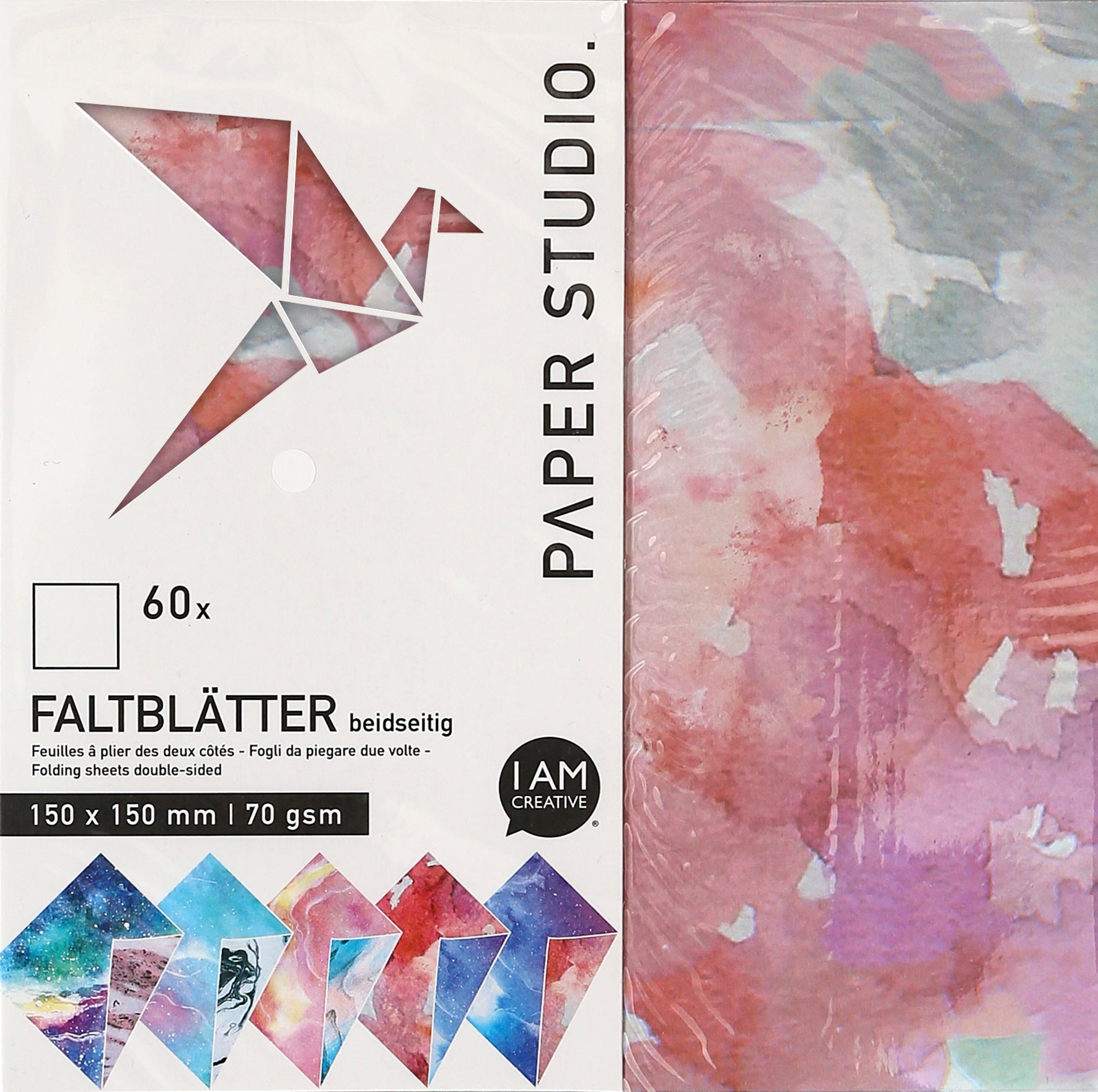Das quadratische Faltpapier Marmor 150 x 150 mm eignet sich für Origami, zum Falten von bunten Tieren, zum Verzieren von Karten und für Scrapbooking. Im Pack sind 60, beidseitig bedruckte Faltblätter mit 10 verschiedenen Motiven enthalten.