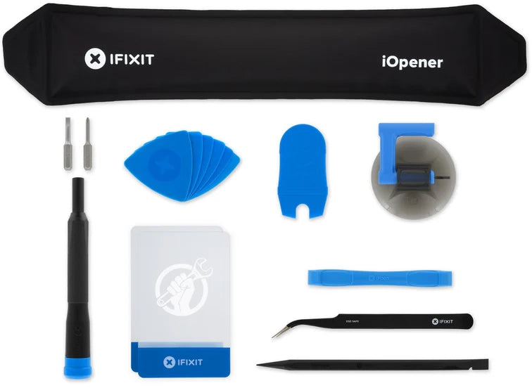 - Kit-Inhalt: iOpener, Spudger, Öffnungswerkzeug, Öffnungspicks (6er-Set), Plastikkarten, Batterieblocker, Saugnapf, Pinzette, Präzisions-Bit-Schraubendreher mit integriertem SIM-Auswurfwerkzeug, 4-mm-Präzisionsbits:, Kreuzschlitz Nr. 00, Schlitz 2,5 mm