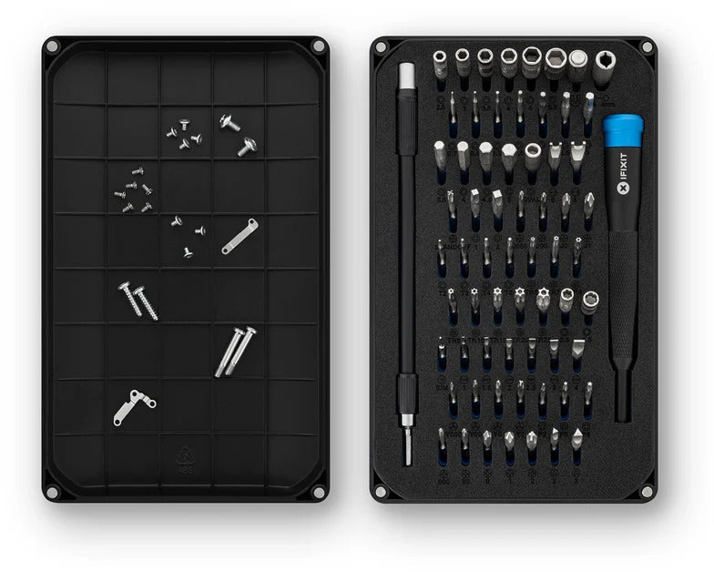Das Mako Schraubendreher-Set enthält den 4-mm-Aluminium-Schraubendrehergriff von iFixit mit magnetischer Bitaufnahme, geriffeltem Griff und drehbarem Oberteil sowie 64 Präzisions-Schraubendreherbits und eine flexible Verlängerung. Wir haben dieses 64-Bit-Schraubendreher-Set anhand von Daten aus Tausenden unserer Reparaturanleitungen und Teardowns entwickelt, um dir das kompakteste und zugleich umfassendste Sortiment an Bits für die Elektronikreparatur zu bieten. Es enthält Standard-, Sicherheits- und Spezial-Schraubendreherbits für eine Vielzahl von gängigen und ungewöhnlichen Reparaturen. Standardbits wie Kreuzschlitz und Schlitz reichen für die meisten kleinen Haushaltsgeräte und Elektronikgeräte. Sicherheits- und ungewöhnliche Bits wie Pentalobe ermöglichen dir den Zugriff auf deine Apple-Geräte wie iPhones und MacBooks. Ob Profi oder Wochenend-Reparaturer ? dieses Bit-Set bietet alles, was du zum Zerlegen, Reparieren und Zusammenbauen von Smartphones, Spielekonsolen, Wearables, Laptops, Desktops, Tablets, Kleingeräten und vielem mehr brauchst! Alle unsere Bit-Sets der nächsten Generation wurden für maximalen Nutzen überarbeitet. Der Deckel des Bit-Kits wird mit Magneten fixiert, um die Lebensdauer zu verlängern (keine kaputten Scharniere oder Verschlüsse mehr). Er lässt sich außerdem an der Rückseite des Bit-Kit-Koffers befestigen, damit er während der Arbeit nicht stört. Wenn Sie Ihre Schrauben und Teile übersichtlich aufbewahren möchten, nutzen Sie die integrierte Sortierschale im Deckel. Unsere 4-mm-Bits wurden mit einem längeren Hals für eine tiefere und präzisere Reichweite überarbeitet.