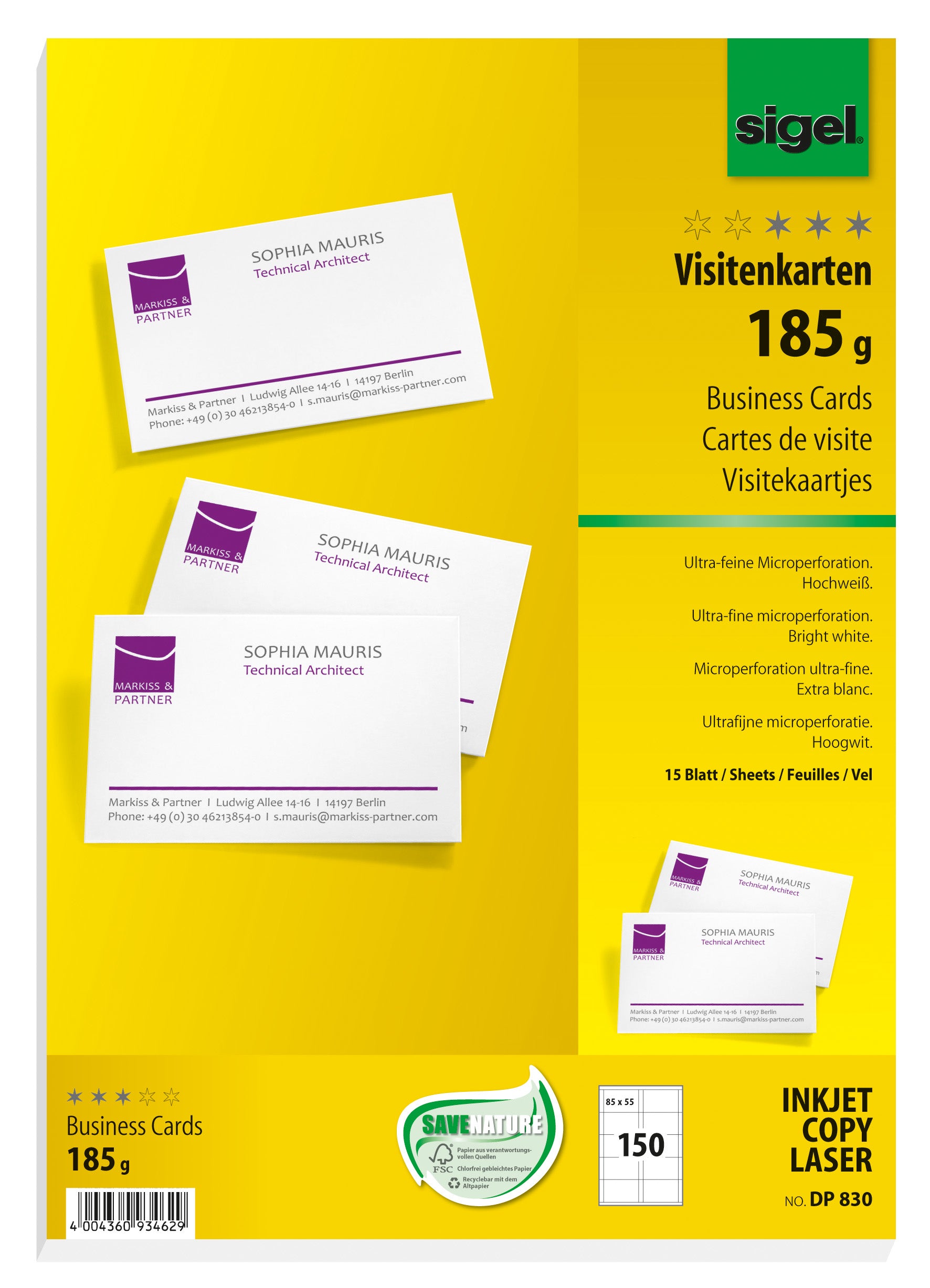 SIGEL Visitenkarten 85x55mm DP830 weiss, 185g doppels. 150 Stück