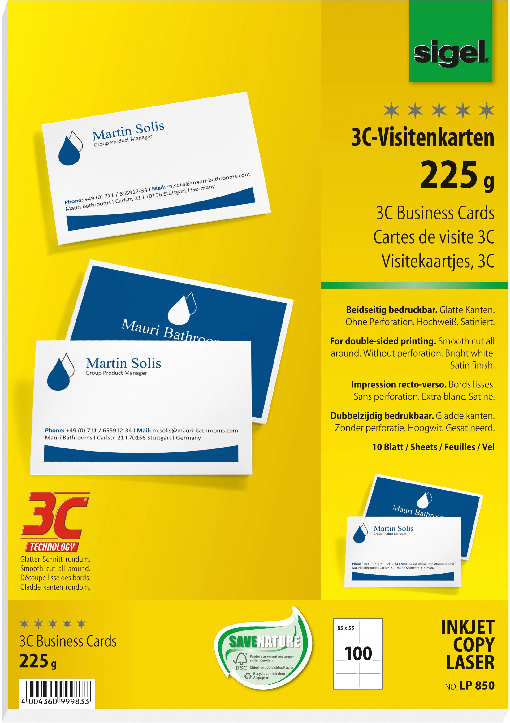 PC-Visitenkarten hochweiss, FSC®-zertifiziert, sind ideal zum schnellen und einfachen Gestalten und Drucken am eigenen PC und Drucker. Einfaches Heraustrennen durch 3C-Technologie: glatter Schnitt rundum ohne Perforation. Die Visitenkarten sind vielseitig einsetzbar beispielsweise für Events, Messen oder geschäftlichen und privaten Kontaktaustausch. Für alle InkJet- und (Farb-)Laser-Drucker sowie Kopierer geeignet.