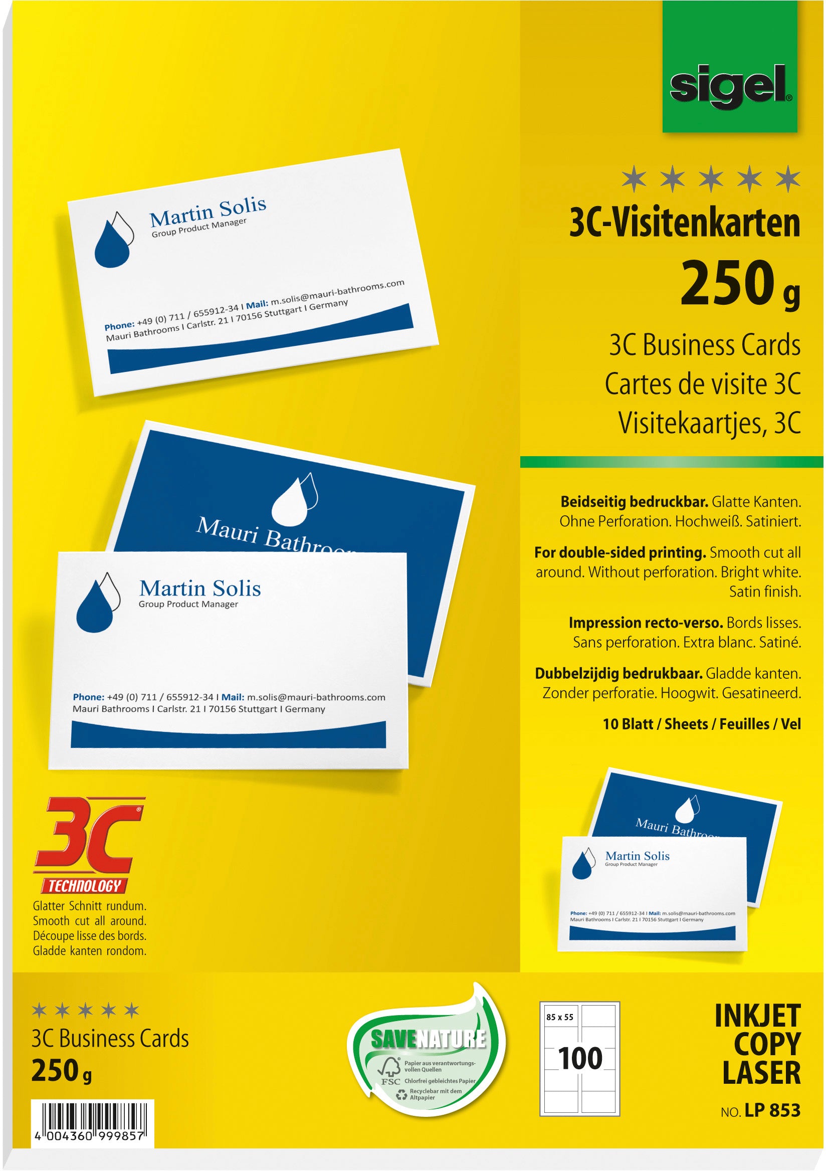 PC-Visitenkarten hochweiss, FSC®-zertifiziert, sind ideal zum schnellen und einfachen Gestalten und Drucken am eigenen PC und Drucker. Einfaches Heraustrennen durch 3C-Technologie: glatter Schnitt rundum ohne Perforation. Die Visitenkarten sind vielseitig einsetzbar beispielsweise für Events, Messen oder geschäftlichen und privaten Kontaktaustausch. Für alle InkJet- und (Farb-)Laser-Drucker sowie Kopierer geeignet.