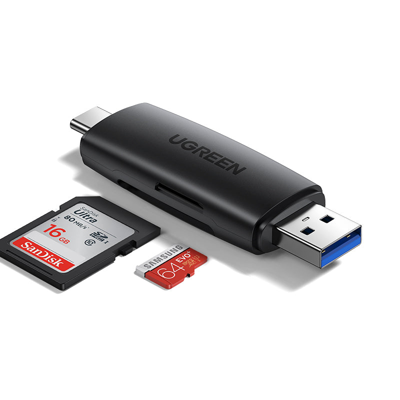 Ugreen kompakter SD- und Micro-SD-Kartenleser. Hergestellt in einem Standard, der eine Datenübertragung von bis zu 5 Gb/s ermöglicht. Ein besonders hervorzuhebendes Merkmal dieses Lesegeräts ist das Vorhandensein von zwei Anschlüssen USB-A und USB-C. Dadurch haben Sie die Möglichkeit, es nicht nur an einen Computer anzuschließen, sondern auch an ein Telefon, das mit einem USB-C-Anschluss mit OTG-Unterstützung ausgestattet ist. Mit dem Lesegerät können Sie zwei Speicherkarten gleichzeitig lesen und beschreiben. Es ist nicht erforderlich, eine Karte herauszuziehen, um die andere einzustecken. Sie können Dateien einfach zwischen Karten oder zum und vom Computerspeicher übertragen. Das Lesegerät kann folgende Speicherkartentypen lesen: SDXC / SDHC / SD / MMC / RS-MMC / Micro SD / TF / Micro SDXC / Micro SDHC / UHS-I.