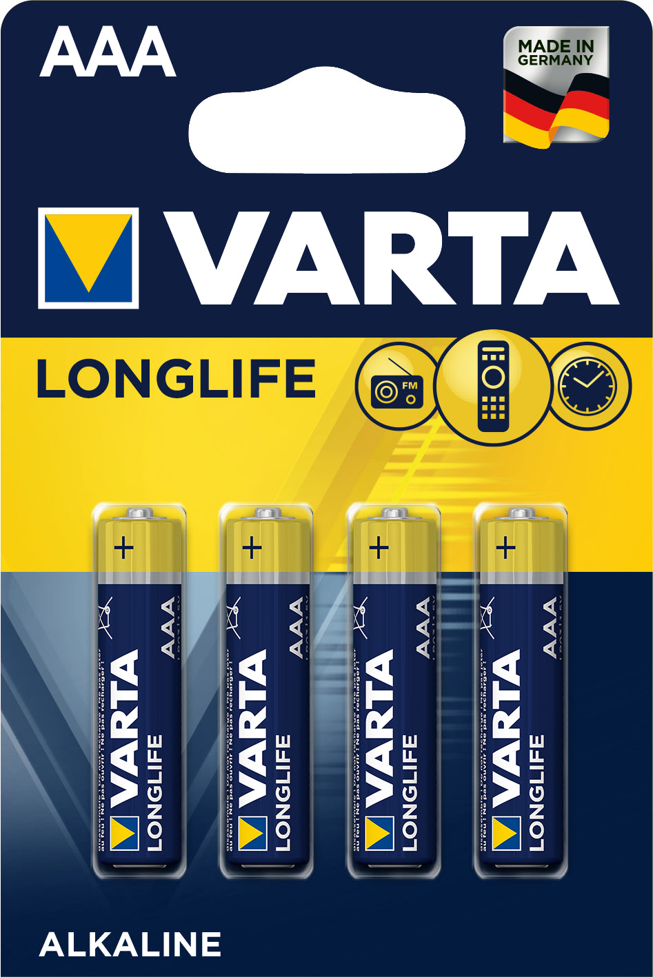 Longlife ? Die VARTA für jeden Tag ? für Standardgeräte des täglichen Gebrauchs, wie Fernbedienungen, Wanduhren, Wecker, einfache Taschenlampen u.v.a ? Mehr Ausdauer bei normalem Energiebedarf ? Die richtige Wahl bei Dauerbelastungen im Niedrigstrombereich ? Sie bietet eine lange Haltbarkeit durch die moderne Alkaline-Qualität ? Langanhaltende Energie vorrangig für einfachere Geräten mit konstanten und eher niedrigen Strombedarfen, z. B. Fernbedienungen, Rauchmeldern, Wanduhren, Taschenrechner, elektronischen Waagen